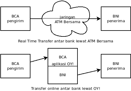 Dengan OY!, aplikasi ini ibarat rekening penampung yang bertindak sebagai perantara. Jadi untuk contoh tadi kita akan diberikan nomor virtual account (VA) bank BCA sebagai tujuan transfer yang kita lakukan dari ATM atau internet banking. Setelah transfer dikonfirmasi (otomatis) oleh aplikasi OY!, OY! akan meneruskan transfer dari rekening BNI mereka ke rekening bank BNI tujuan.