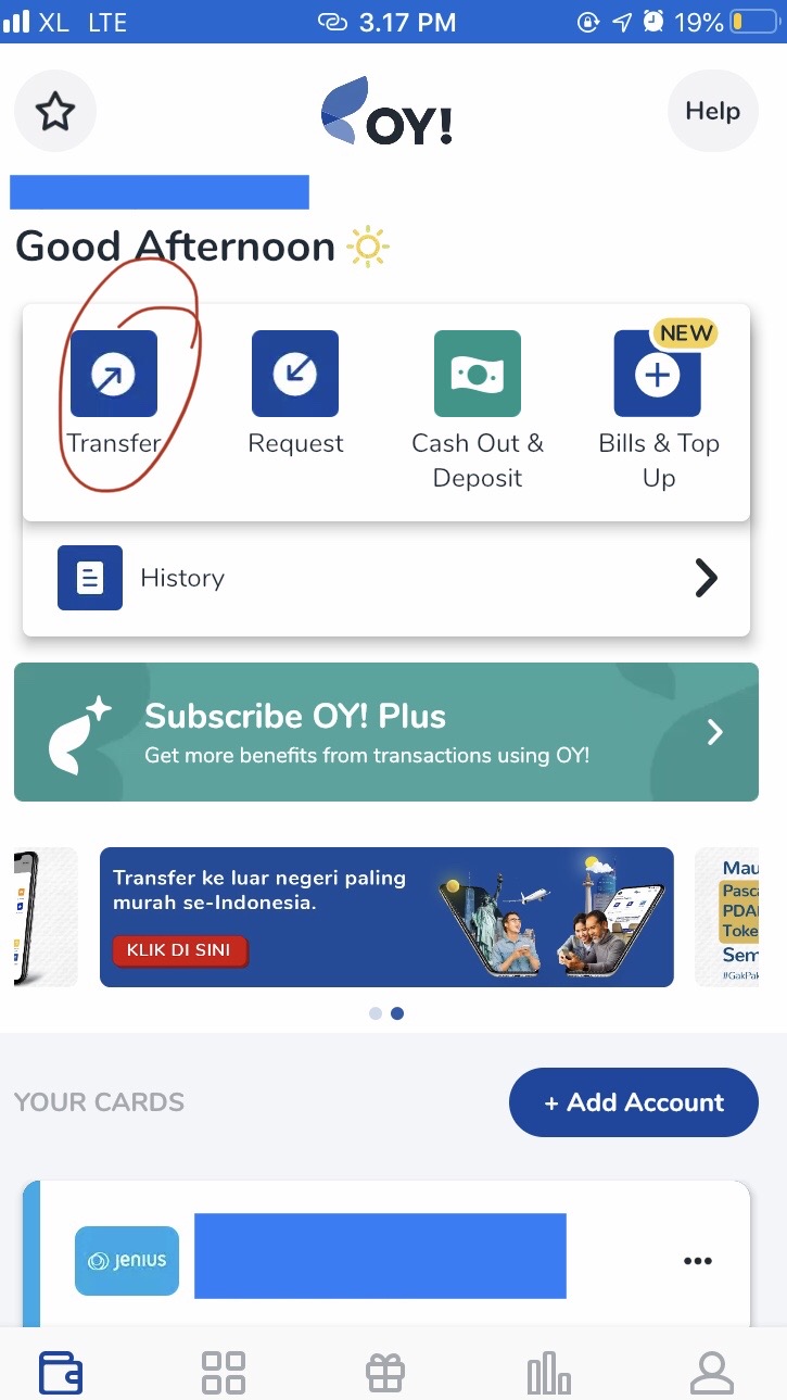 Pergi ke ATM atau buka internet banking dan lakukan transfer ke nomor rekening perantara tersebut sesuai jumlah yang diminta. Setelah selesai transfer, kembali ke aplikasi OY! dan lakukan konfirmasi.